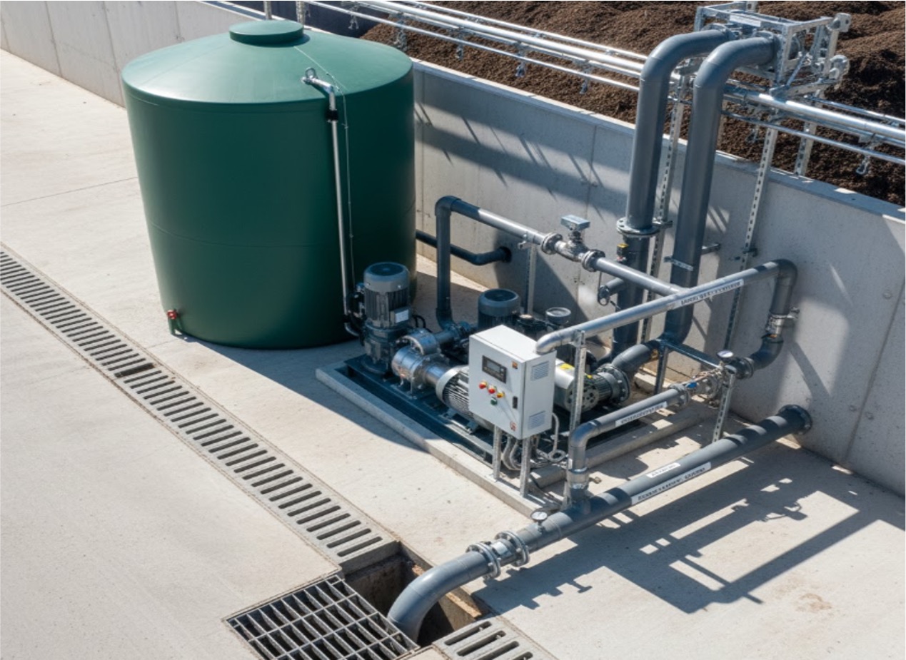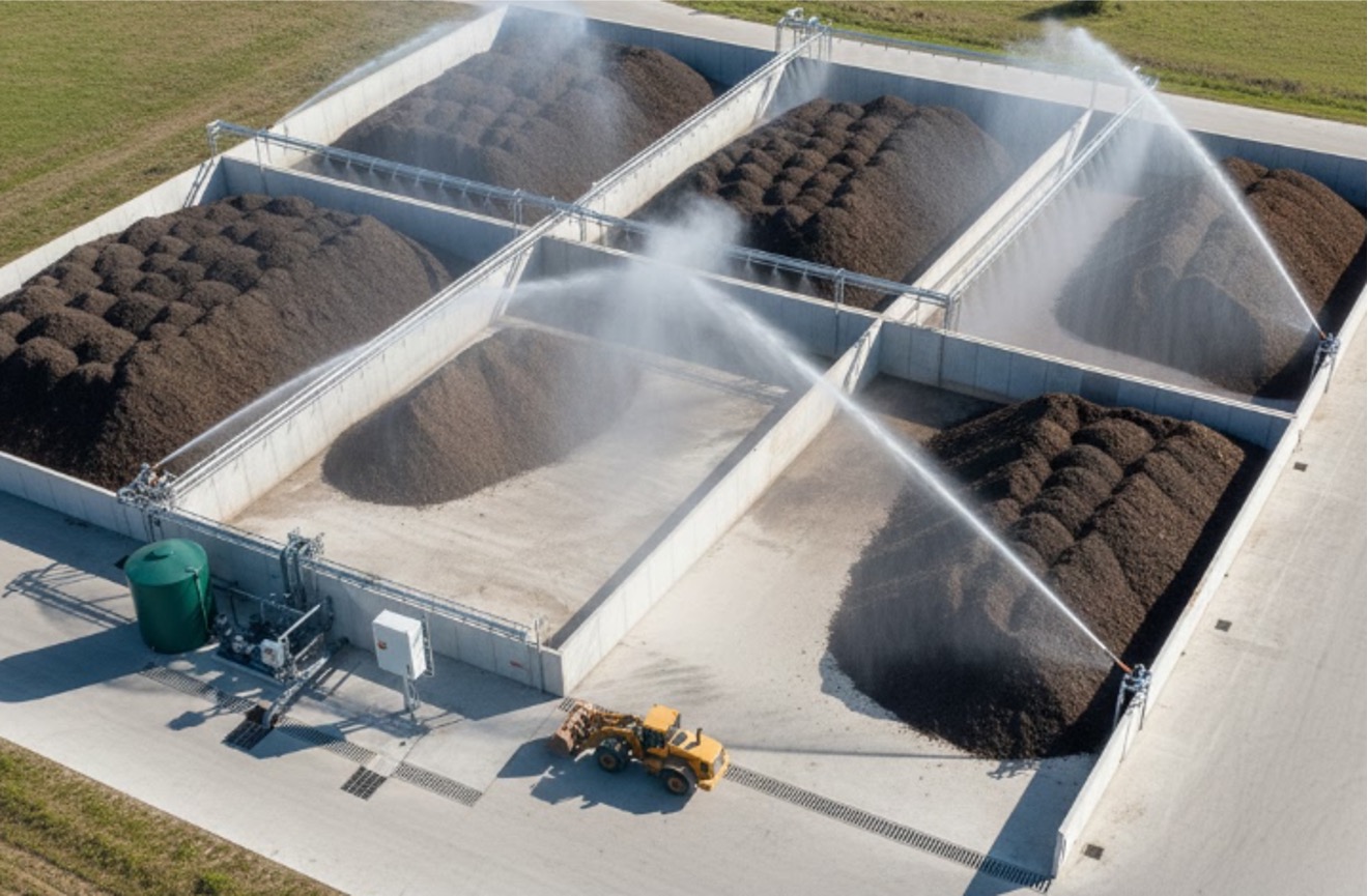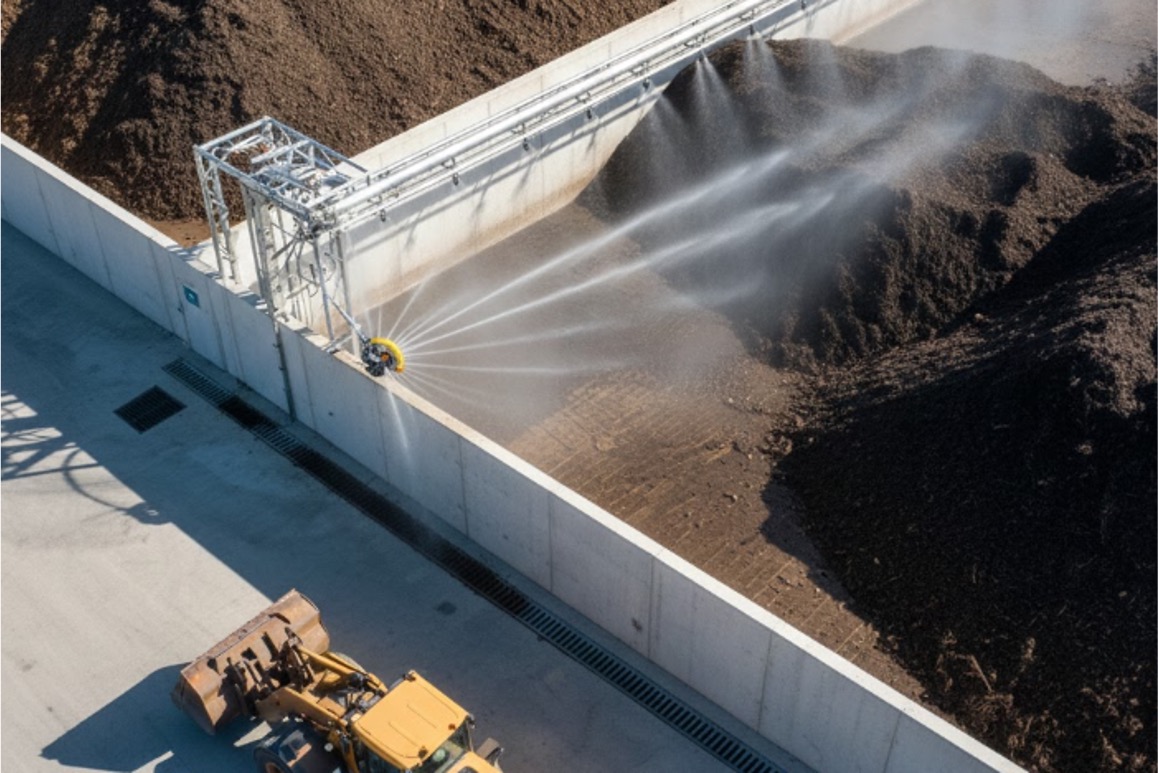 The system is designed for automatic operation, with control sequences that allow each bay to be irrigated in turn or in defined groups, depending on pumping capacity and operational preference. Run times per bay can be adjusted to reflect seasonal conditions and the moisture state of the compost, but the operating principle remains simple: run the sprays until the pile is wet through and then allow runoff to drain back to the collection pit.